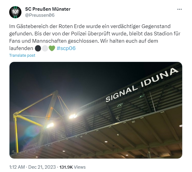 官方消息傳來,原定于北京時間12月21日凌晨2點進行的普魯士明斯特與多特蒙德2隊之間的德丙比賽被迫推遲。原因在于警方在羅特艾德球場附近發(fā)現(xiàn)了一物疑似雷管的物體。明斯特官方社媒發(fā)布聲明稱:“
